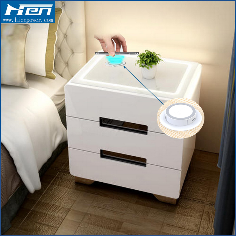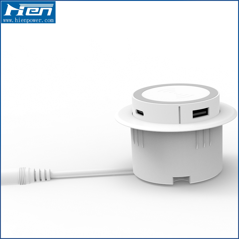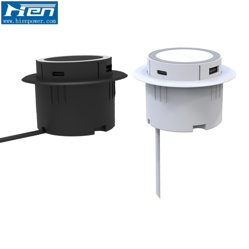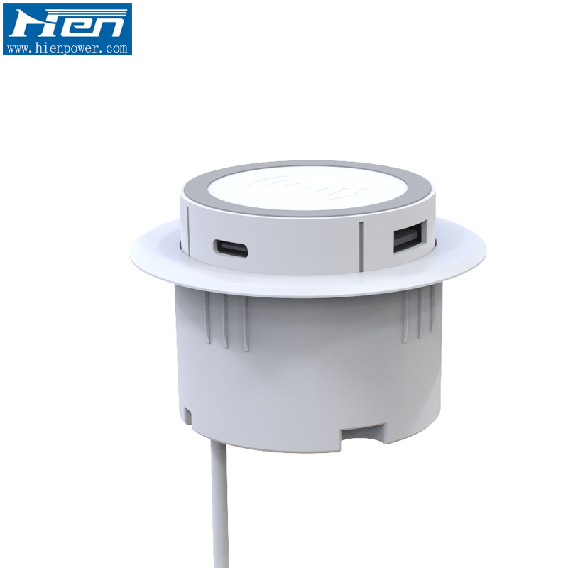 HE-D08 is A fast embedded wireless charger designed for furniture, with 1 channel USB-A and 1 channel USB-C output, with simple and generous, easy installation, full protection function, strong compatibility and other features. It is mainly used in restaurants, hotels, bars, airports and other public places, as well as coffee tables, bedside tables, desks and other family or office scenes.