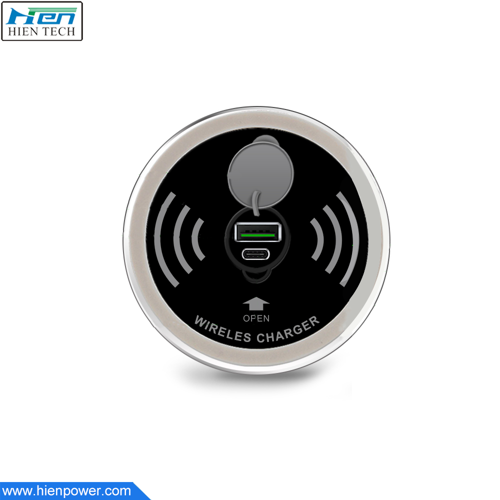 HE-6001U is a built-in fast wireless charger specially designed for furniture. The shell is chrome-plated and has 1 USB A and 1 USB C interface output. It is powerful, simple and elegant, easy to install and full of protection functions. , strong compatibility and so on. Mainly used in restaurants, hotels, bars, airports and other public places, as well as coffee tables, bedside tables, desks and other home or office scenes.